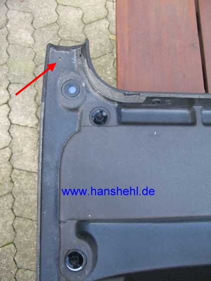 | Die kleine, seit Herbst 2002 vorhandene Schraube (Pfeil) wird auch entfernt. |