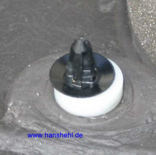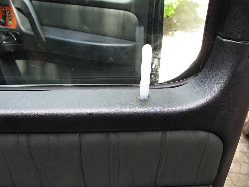 Der Tür-Schließstift sollte zum Abnehmen der Verkleidung zumindest eingedrückt sein, er behindert das Hochheben der Türverkleidung. Hebelt man vorher den Gummiring über den Stift heraus, ist das Abheben viel leichter. Die Schlossfalle nach unten drücken (2. Rastung), dann kann der Stift nach unten gedrückt werden. Zum Einbau steckt man ein kurzes Stück (3-4 cm) einer Kunststoffbenzinleitung (Innendurchmesser 8 mm) auf den Stift. Dann kann man die Verkleidung leicht über den Stift schieben. |