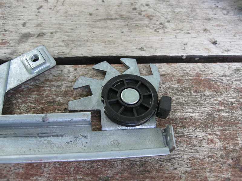 Ich habe mal versucht, die obere Rolle zu ersetzen. Die habe ich aus einem Altteil (Fensterheber vordere Tür) ausgebaut. Auf der Unterseite den verstemmten Zapfenteil (Radachse)vorsichtig abschleifen und dann ausdrücken. Leider ist der Zapfen für den Fensterheber der Fondtür zu kurz und nicht verwendbar. |