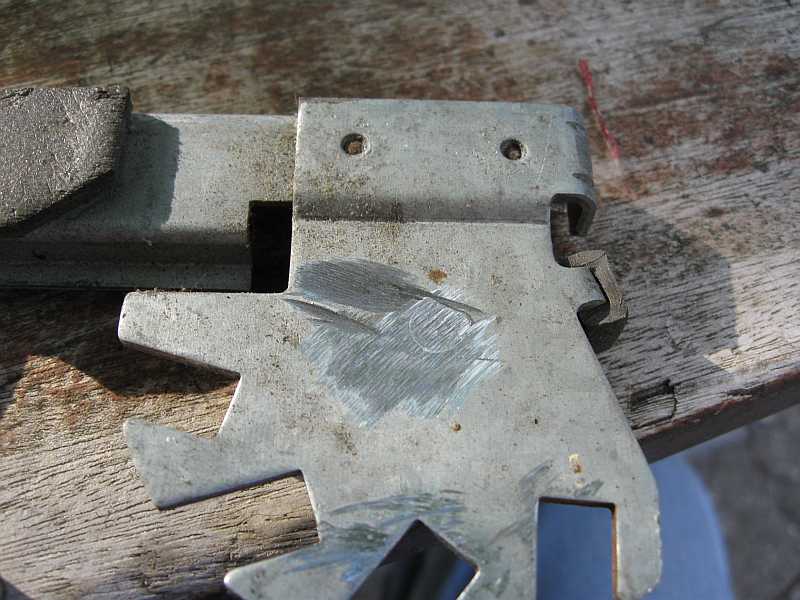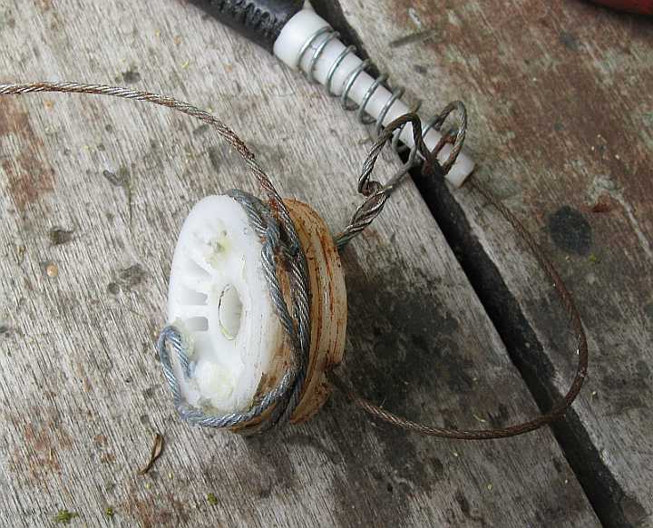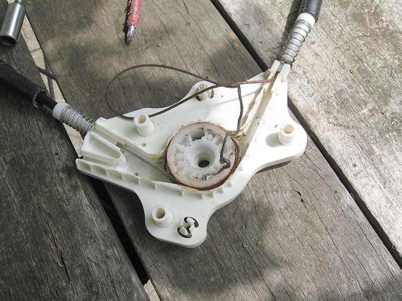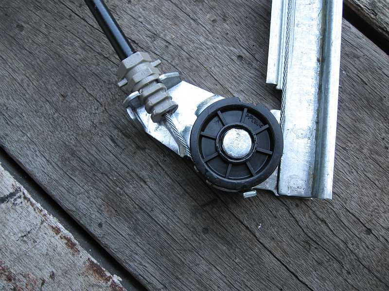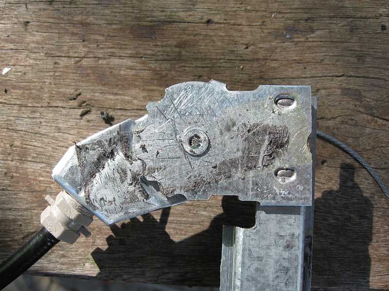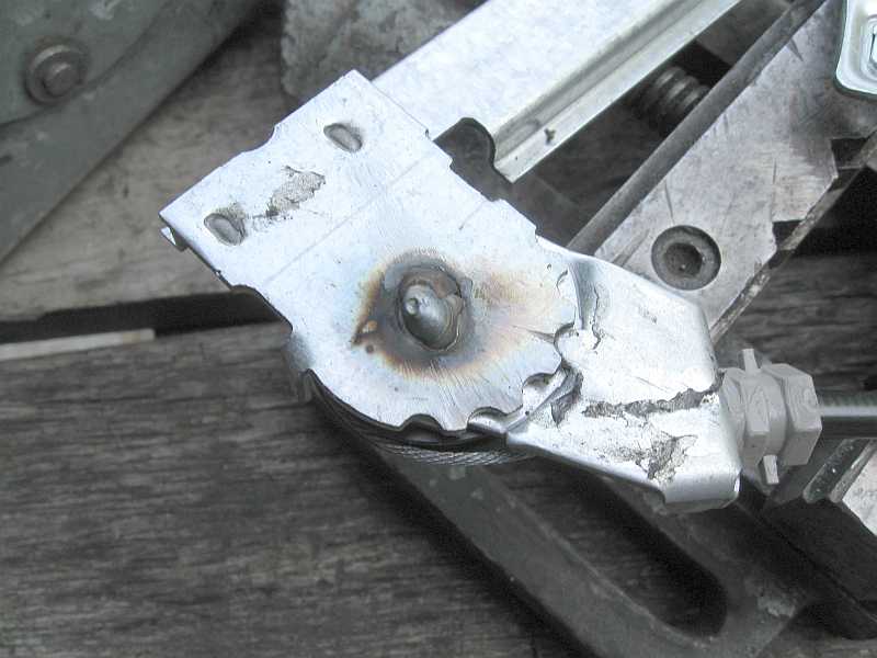 Das andere Seil (nicht verrostet) hatte sich auf der anderen Seite unter der Seiltrommel ebenfalls verklemmt und war an der Befestigung am Gleitstück an der Führungsschiene ausgerissen. Siehe auch Seiltrommel tipp6a6.htm#b2. |