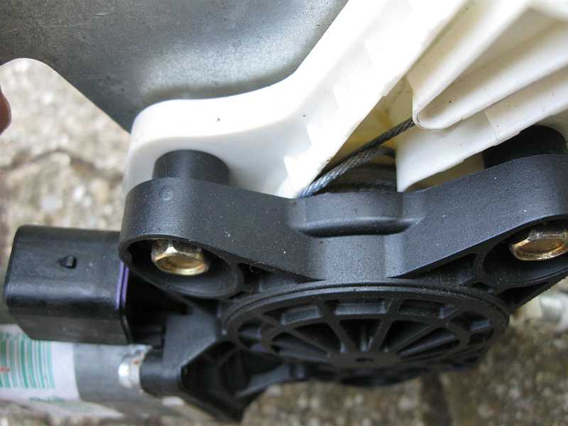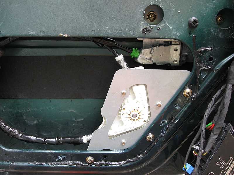 Nach dem Lautsprecherausbau das Trägerblech für den Lautsprecher abschrauben. Der Fensterhebermotor ist mit drei Schrauben am Türrahmen befestigt, diese abschrauben. Dann je zwei Schrauben oben und unten am Fensterhebersystem herausdrehen. Fensterheber komplett aus der Fondtür herausnehmen. Beim Einbau den Motor zum Fensterheber nicht verdrehen. Der untere Seilzug am Motor führt zur unteren Umlenkrolle des Fensterhebers. |
