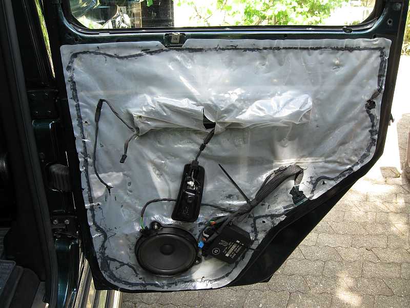 Fenster ist geschlossen. Zuerst den Türbelag AR72.12-P-1010GN und dann den Lautsprecher ausbauen: AR82.62-P-7874GN . Das Türsteuergerät vom Lautsprecherträger abbauen, dabei nicht die Kabelstecker abziehen. Das Steuergerät oben etwas anheben, dazu die zwei oberen Spreitzfüsse nacheinander zusammendrücken, und nach nach hinten abziehen: AR72.29-P-1100GN. Anschließend die Türfolie vorsichtig vom Türrahmen lösen (mit scharfem Kartonmesser die schwarze Butylmasse so durchschneiden,dass an der Folie und am Türrahmen Butylmasse verbleibt. |