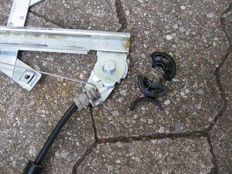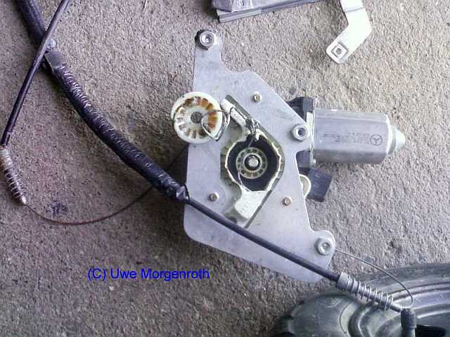 Ende Juni 2012 blieb nun auch bei meinem sechs Jahre alten G55AMG die Scheibe der rechten Fondtür mit einem lauten Knacks halbgeöffnet stehen. Die Ursache war nach dem Ausbau klar. Das obere Umlenkrad des Seilzugs war in mehrere Teile zerbrochen. Der Seilzug hatte sich in der Seiltrommel verklemmt. Und die Scheibe konnte nach dem Ausbau des Fensterhebers nur mit viel Kraft ganz nach oben geschoben werden. Also zuviel Reibung in der Fensterführung durch Staubablagerungen (siehe u.a. Wartung). |