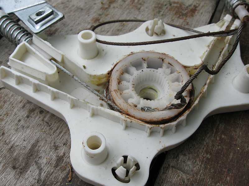 Bei einem G350CDI, 461.341, Bj. 1/2010, war nach drei Jahren im Juni 2013 der Fensterheber der rechten Fondtür defekt. Nach dem Ausbau des Fensterhebers zeigte sich, dass ein Seilzug stark verrostet war und sich in der Seiltrommel verklemmt hatte. |