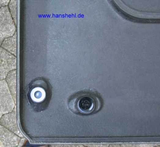 | Beim Einbau habe ich einige Clipse weggelassen (siehe weiße Sockel), die Verkleidung hält genauso und lässt sich später leichter ausbauen. |