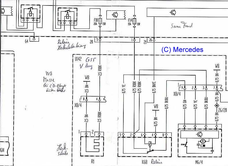 | Im SAM Fond N10/2 sitzt das Relais N10/2KF (Relais 1, Klemme 15R). Von SAM-Fond Pin 1 werden über eine 15A-Sicherung (Si 14) der Pin 2 vom Relais K68 und die schwarz-blaue Leitung zum Wischermotor immer mit 12 V versorgt. Das Relais K68 befindet sich im Gerätefach unter dem CD-Wechsler (3. Relais von links, gelb). Das SAM Fond N10/2 (Pin 26) steuert das Relais K68 (Pin 6) mit 12 V an, Pin 4 liegt an Masse (W8). | ![]() |