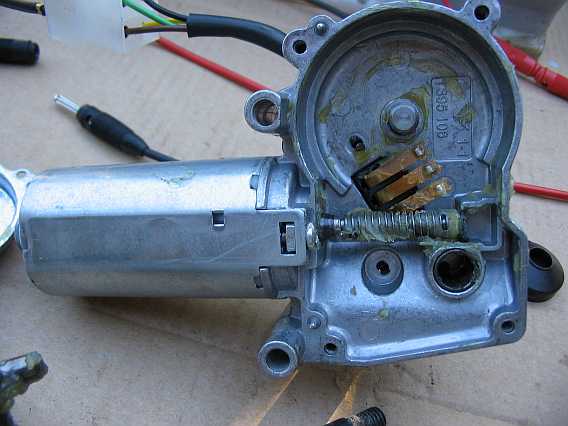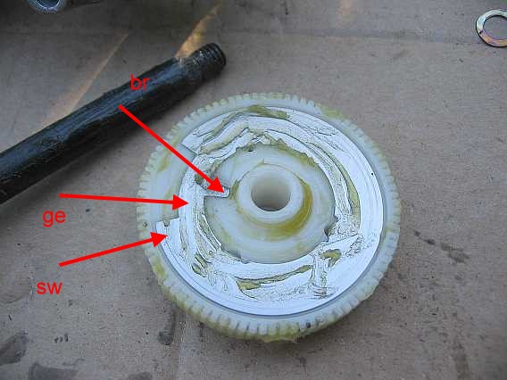 Das Kunststoffzahnrad hebt man beidseitig mit zwei Schraubendreher vorsichtig hoch. Darunter sind die drei Kontaktfedern, die auf die Schleifringe unterhalb des Kunststoffzahnrades drücken. |