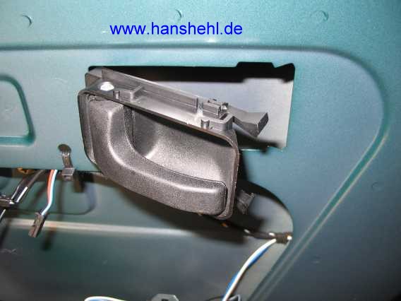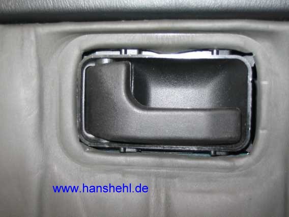 Nun sollte der Türgriff abgeschraubt werden. Die beiden Abdeckungen (links A4637430130 bzw. rechts A4637430230) der Schrauben werden mit einem kleinen Schraubendreher außen seitlich zum Griff hin weggedrückt und herausgezogen. |