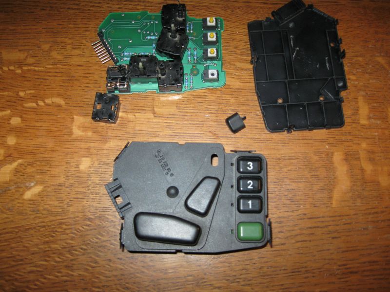 Die rechte Schaltergruppe Sitzmemory S90 A2108209010 (034631 15) ohne Lenksäulenverstellung von einem G400CDI von 3/2002 war defekt und wurde erneuert. Sie stand für die Dokumentation zur Verfügung (Danke U.M., G-Club). Die Gehäuseteile ließen sich mit einem kleinen Schraubendreher leicht trennen. |