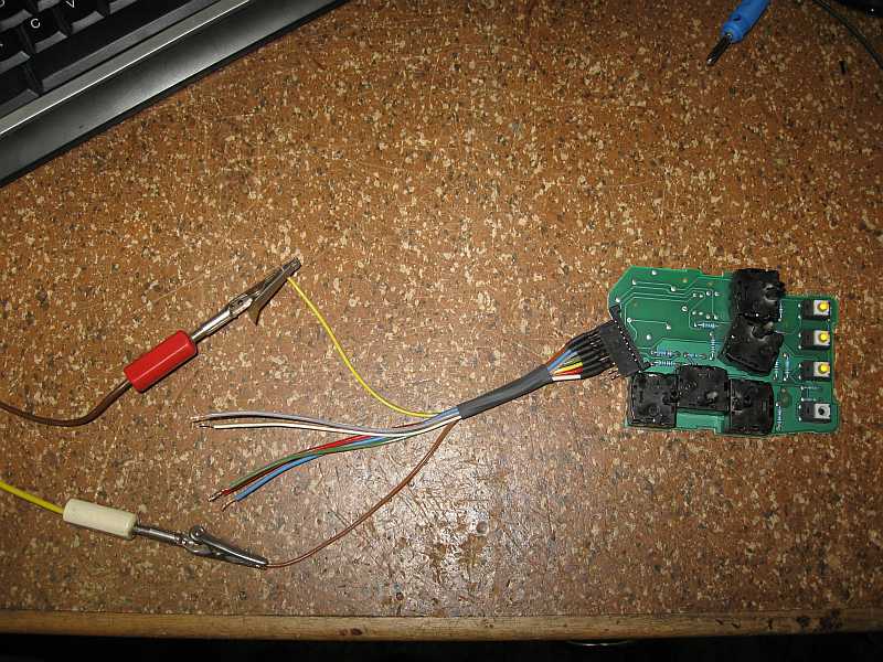 Der Schaltplan des Türsteuergerätes enthält auch die Verbindungen zur Schaltergruppe. Den Tasterbetätigungen entsprechen bestimmte Widerstandswerte nach Masse. Die Werte werden spannungscodiert über die Eingangskanäle A,B,C (D nur mit Lenksäulenbetätigung) an das Türsteuergerät übermittelt. Über den Innenraum-CAN-Bus B werden vom Türsteuergerät über das Sitzsteuergerät die Motoren im Sitz angesteuert. Mit einer Flachbuchsenleiste kann man sich für das Tasterfeld einen Steckadapter bauen. Oder man nimmt den originalen Stecker. Die drei Leuchtdioden der Speicherplatz-Tasten sind an Kl. 58d ( ST1: regelbare Instrumentenbeleuchtung, ST5 Masse) angeschlossen und leuchten hell mit 12 V. |
