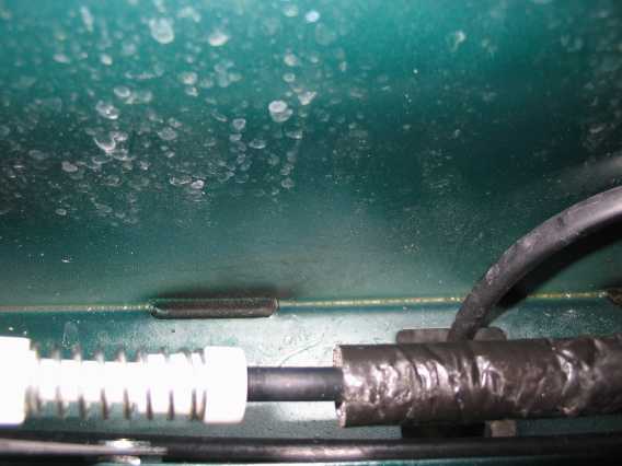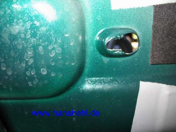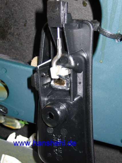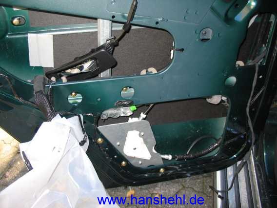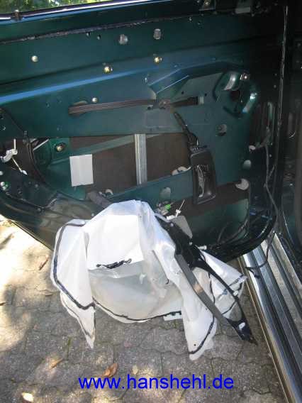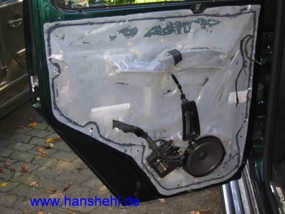 Der Ausbau der Türverkleidung der linken Fondtür ist bei der rechten Fondtür näher beschrieben und identisch. Die Blechteile in der Tür sind nicht konserviert und durch Feuchtigkeit besonders in den Ecken rostgefährdet, da nur grundiert. |