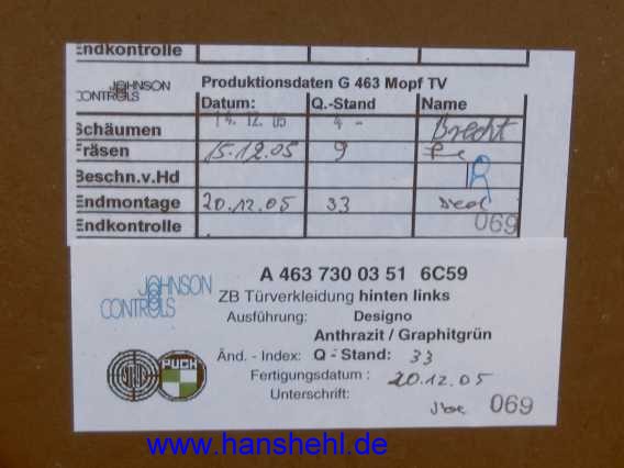 Den Abbau der Türverkleidungen begann ich beim G55AMG bei der rechten Fondtür. Die nach 5 Türen gesammelten Erfahrungen sind dort: enthalten, also sollte man ihn zuerst lesen.