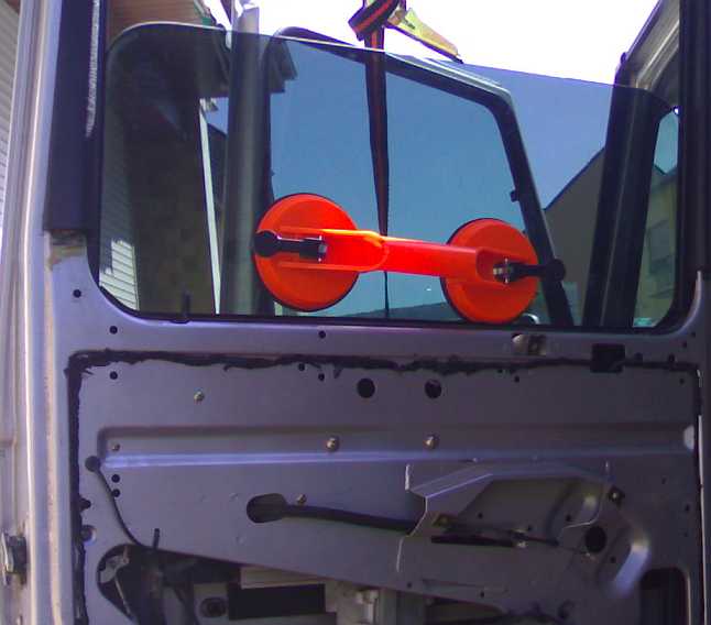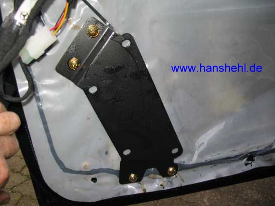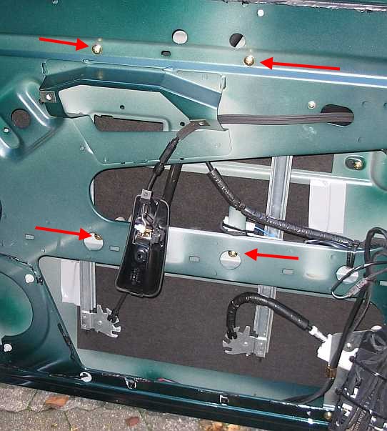 Die Bilder sind von der Fahrer- bzw. Beifahrertür. Die Befestigung der Scheibe am Fensterheber lösen (Schrauben der zwei Schraubklemmen mit Gummizwischenlage). Die Scheibe hochschieben und oben fixieren, z.B. mit einem Saugheber oder Kunststoff-Montagekeil. Die drei Schrauben der Motorträgerplatte und die vier Schrauben des Fensterhebers an der Tür lösen. |