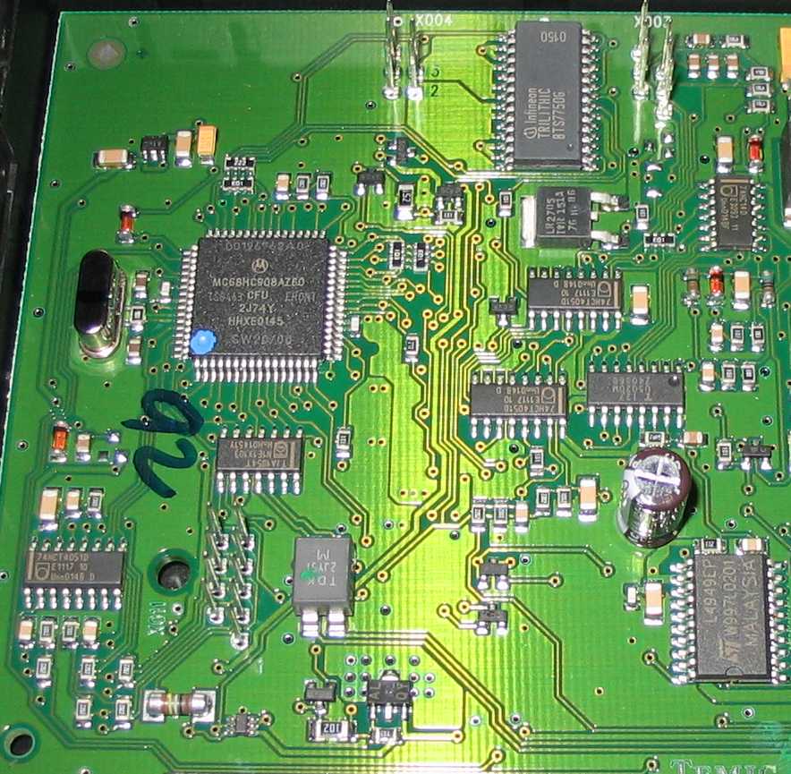 Die CPU ist ein 68HC908AZ60 von Motorola, ein 8-Bit-Mikroprozessor mit 64 Pins. Ein Datenblatt gibt es hier . Die CPU enthält z.B. einen CAN-Bus 2.0 Controller, 60K-Flash-Speicher, 1K-EEPROM, 2K-RAM, serielles Interface SPI und SCI, zwei 16bit-Timer, 15-Kanal-Analog-Digital-Converter, spezielle Resetlogik bei illegalen Opcodes, Adressen und Niederspannung. |