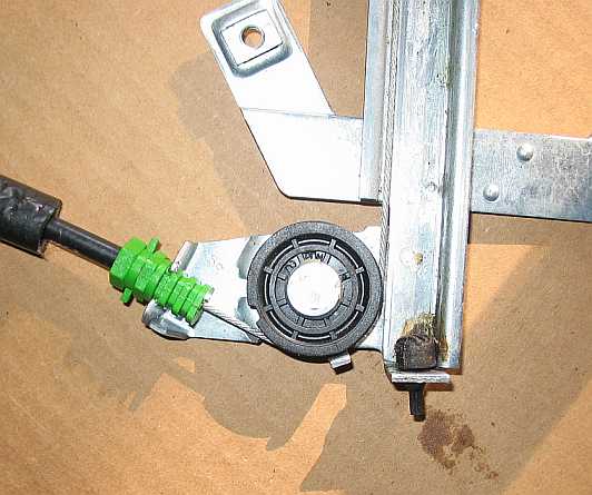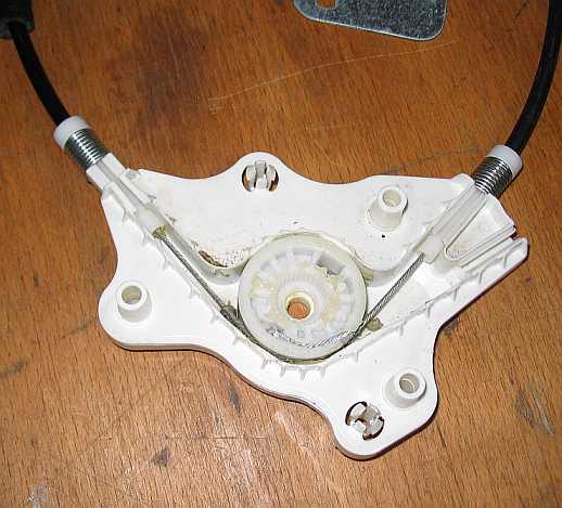 Zwei Drahtseile werden gegenläufig mit etwa zwei Windungen auf der Seiltrommel auf- oder abgewickelt. Jeweils ein Seilende ist einfach in die Aussparung der Seiltrommel eingehängt. Bei den Fensterhebern der Fondtüren sind die beiden anderen Enden in der Anschraubplatte des Fenstergleiters eingehängt. Siehe auch Fensterheber Fondtür rechts: Defekter Seilzug. |