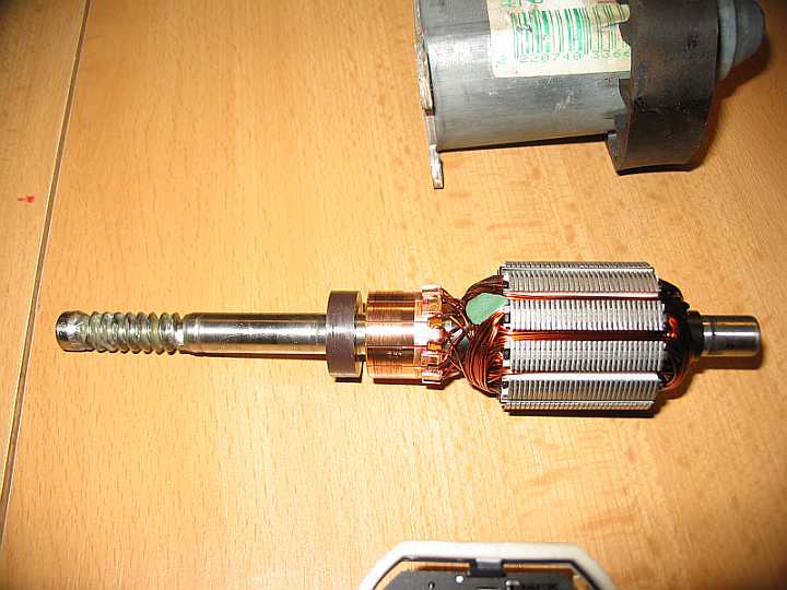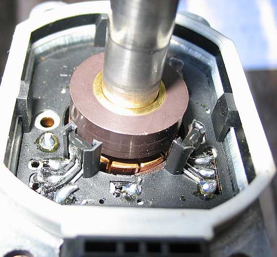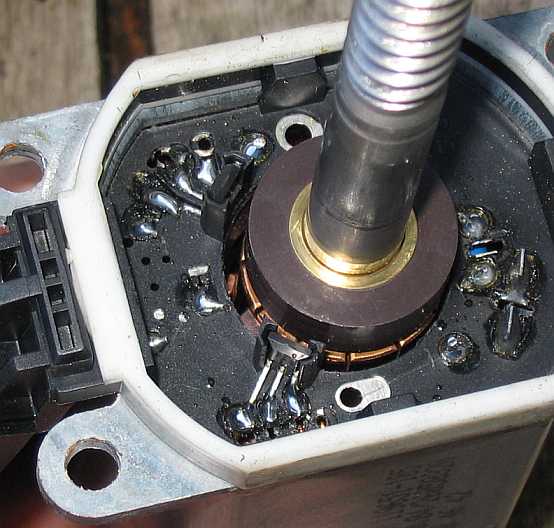 Den Rotor mit der Elektronikeinheit mit den zwei Hallgebern und den Schleifkohlen für den Elektromotor kann man einfach aus dem Gehäuse ziehen. An die Schleifkohlen und den Kollektor darf kein Fett kommen. |