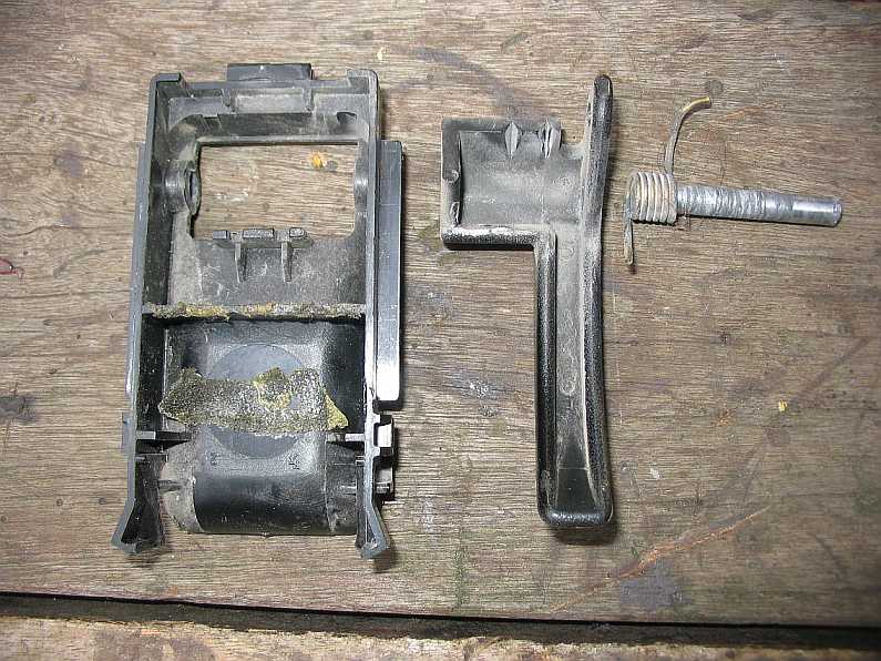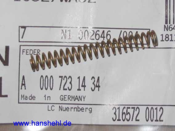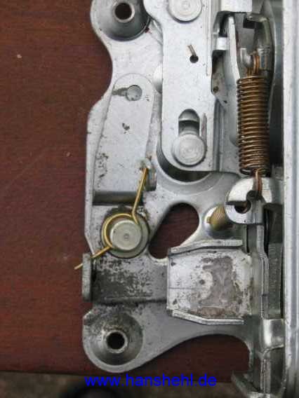 | Mit einem kräftigen Dorn verbiegt man den längeren Federteil so, dass die Aussparung am Federende frei wird und zieht den Federteil heraus. Vor dem Einbau ist alles gut einzufetten. | ![]() |