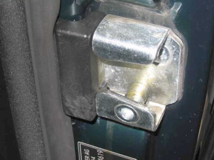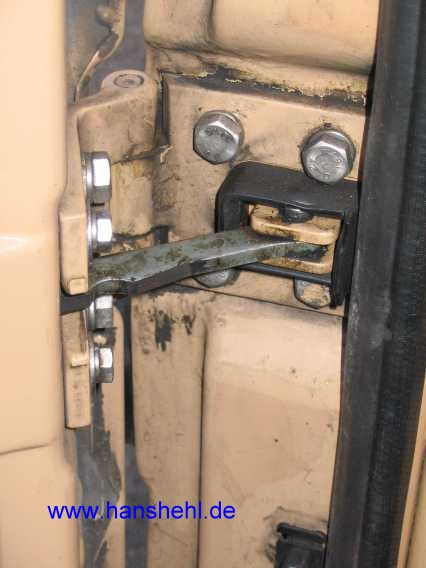 Auch die Scharniere sind seit 1979 bis jetzt gleich geblieben und die Probleme, da die Scharniere nicht regelmäßig geölt werden . Beim 240GD hatte ich damals das alte Türscharnier herausgefräst und das Scharnier an der Tür verschraubt. Die Löcher waren auf der Innenseite im Blech schon vorgestanzt. Siehe auch Türscharnier 280GE (Tipp 98-6, Abschnitt 7.1.1) und Türscharnier ersetzen 280GE (Tipp 109). Teile: siehe Tipp 109, Abschnitt 12 |