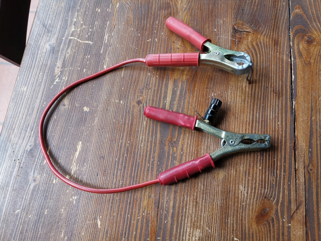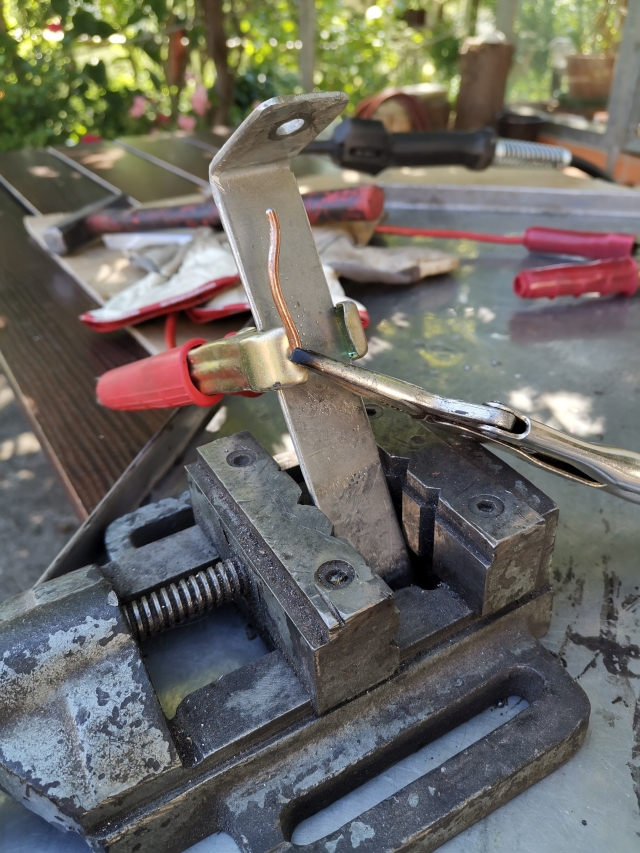 Kleine Stücke eines Autogenschweißdraht passend gebogen und an eine Spannzange von einem alten Starhilfekabel angeschweißt.