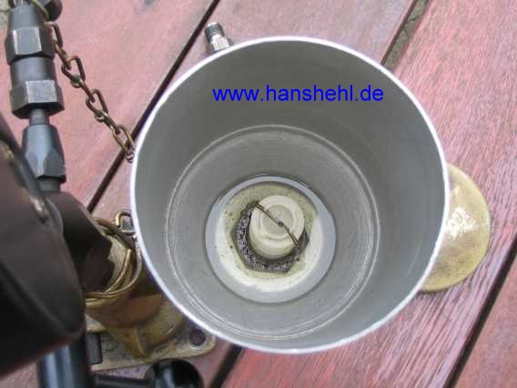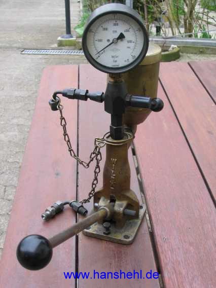 | Alle Teile bekommt man auch bei Fa. Dieselkontor.de, auch ein Prüfgerät. Nun habe ich ein Gerät leihweise bekommen (Danke Franz!). Im Metallbecher sitzt ein Grobfilter. Das Ganze muß aber vorher mal gereinigt werden und das Druckmanometer zeigt auch schon 15 bar ohne Druck an. | ![]() |