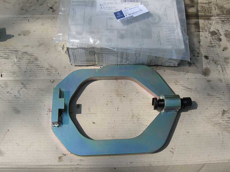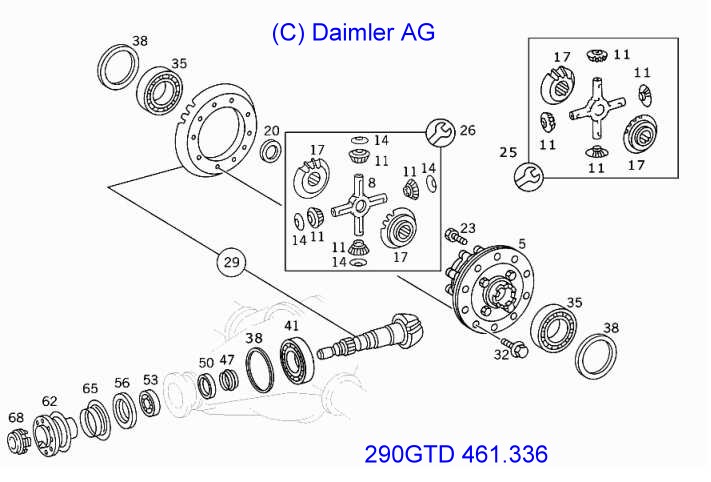 Werkzeug W460589053100 (Preis 01.04.2014): Achse 741.1/13/2/4/5/6, 742.6 Damit man das Tellerrad ausbauen kann, muß das Differenzial-Gehäuse seitlich gestaucht werden. Es gibt von Mercedes ein Sonderwerkzeug W460589053100, siehe auch WS35.00-N-3139C - 190,35 (alt: 368,90) Euro ohne MwSt., (alte Nummer W601589003100 - 430,46 Euro inkl. 19% MwSt.). Mit einem Ringschlüssel (27 mm) und einer Verlängerung (etwa 1m) wird mit etwa 2 Umdrehungen der Schraube das Gehäuse zusammengedrückt, damit man die Lager entnehmen kann. siehe AR33.30-P-0432GX (Suchwort z.B. Tellerrad) |