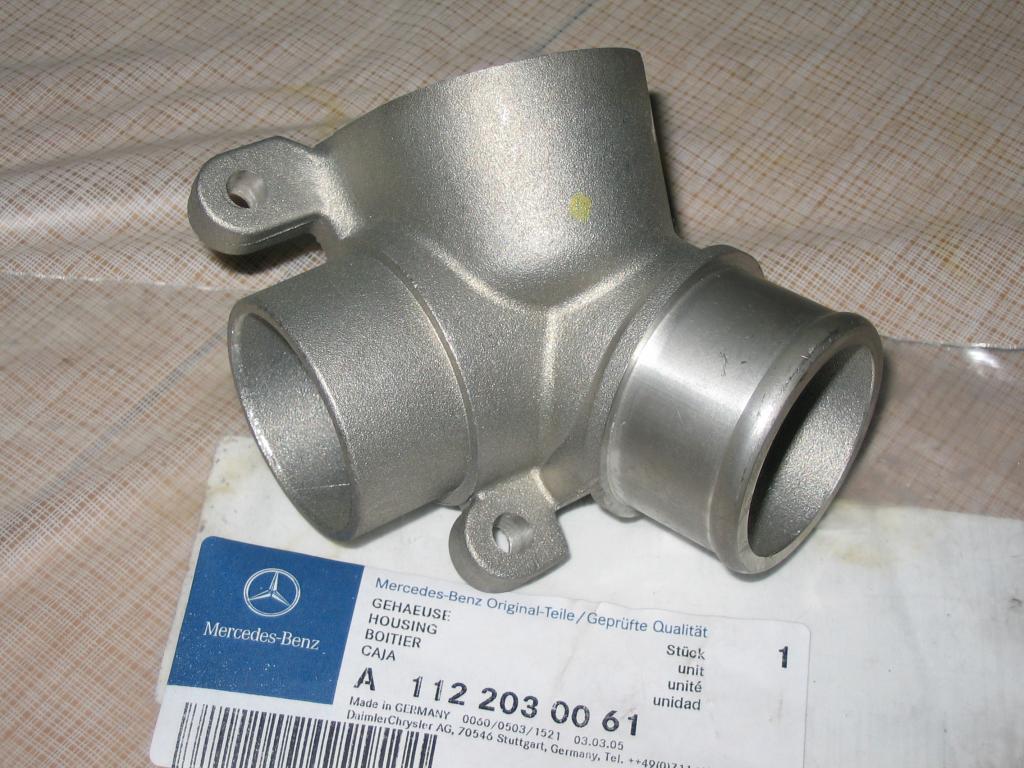 Das Gehäuse A1122030061 besitzt ein Innengewinde M38 x 1,5 für den Tauchsieder. An den geraden Stutzen (ohne Randverdickung, außen: 42 mm, innen: 36 mm) wird das kurze Schlauchstück aufgesteckt. Auf den zweiten Stutzen (gleiche Maße, mit Randverdickung) kommt der neue kürzere untere Kühlerschlauch. Der Lochabstand der Befestigungsstutzen beträgt 69,5 mm. |