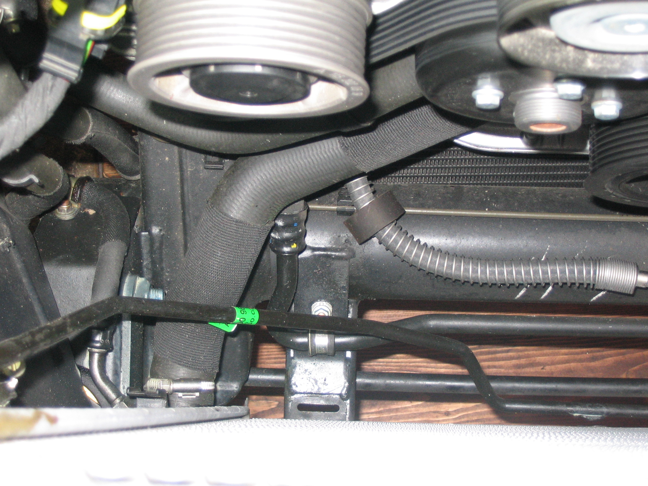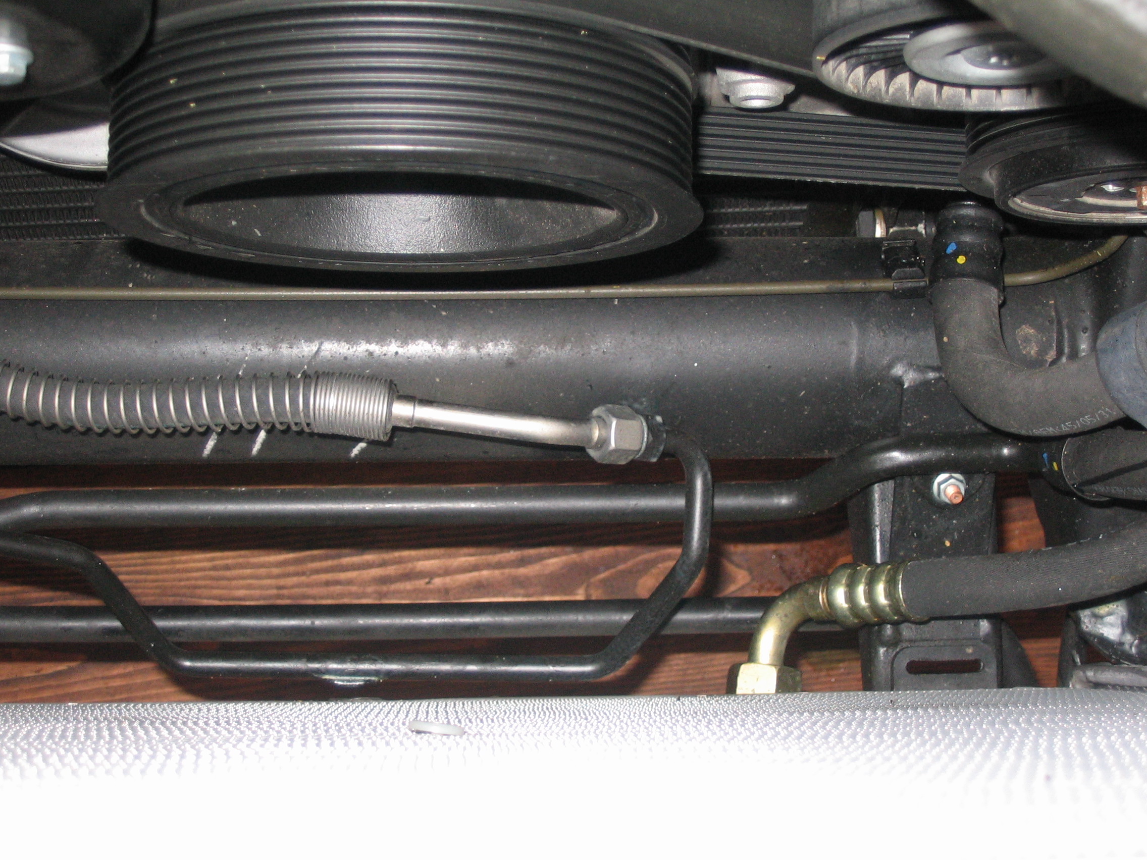 möglich, da drei Ölkühlerleitungen im Wege sind. Also muß der Elektro-Sauglüfter mit Abdeckung ausgebaut werden (Lüfterhaube ausbauen: AR20.40-P-6800GX). Dazu muß der Kühlergrill abgebaut werden. Danach die obere Querstrebe abschrauben. Das Lüftergehäuse ist am unteren Rand in der Mitte mit einer M6-Schraube befestigt. Nach dem Lösen der Schraube und nach Abziehen des Steckers zieht man den gesamten Lüfter vorsichtig mit etwas Kraft nach oben heraus. Nun muß noch der Kompressor-Rippen-Keilriemen abgenomen werden. Man kann auch schon vorher das Kühlwasser ablassen (mit Schlauch 10 mm Innendurchmesser), im sauberen Kübel auffangen). Weitere Hinweise und Bilder: siehe Tipp76. |