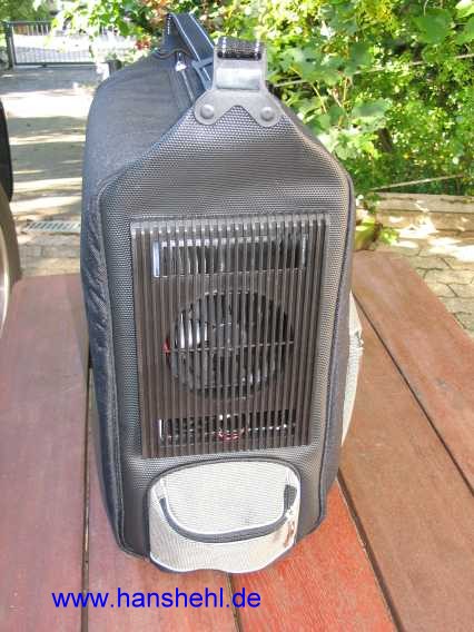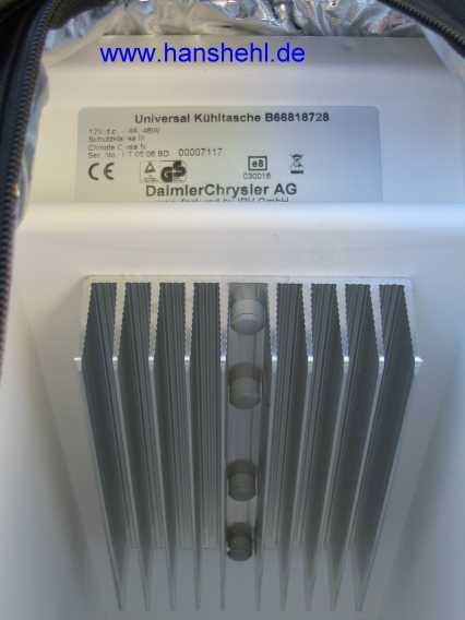 | Bei DC gab es als Prämie für die Roadmiles der Mercedes Card eine schöne Kühltasche (B66818728 - ), die man bei DC auch kaufen kann (115 Euro inkl. MwSt.). Hergestellt wird sie von der Fa. IVP GmbH (www.ivp-hungen.de). Die Kühlung arbeitet geräuschlos mit einem Peltierelement 12V 4A /48 Watt und bietet Platz für 4 Mineralwasserflaschen. Aber den Stecker sollte man durch einen stabileren ersetzen, wie schon beschrieben. | ![]() |