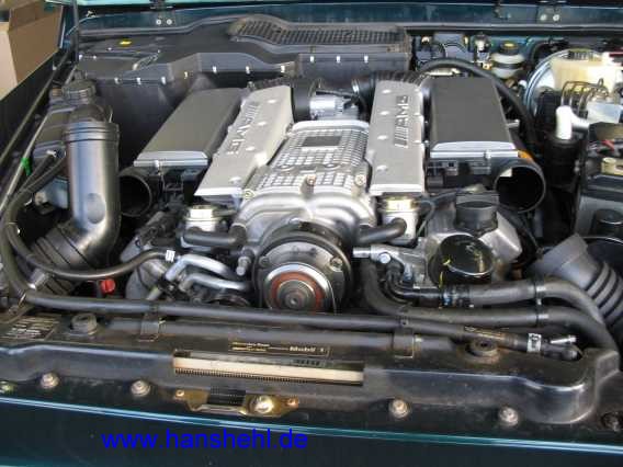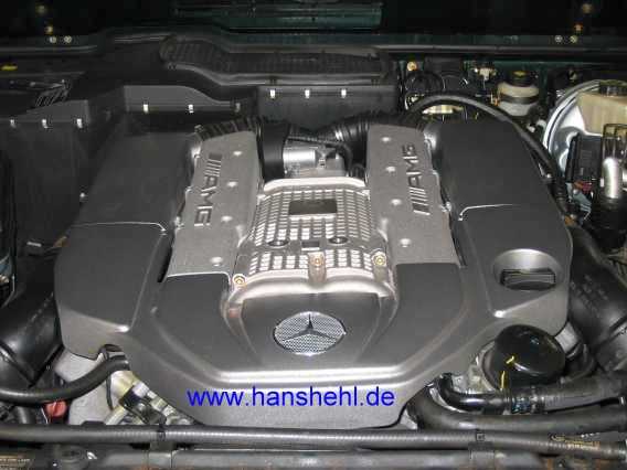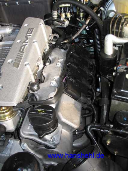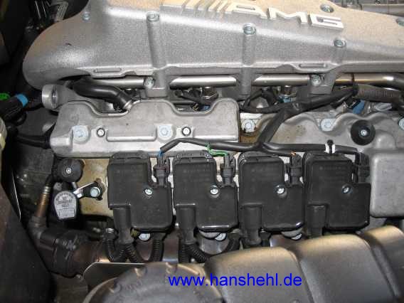 Die Arbeit ist bei den M113.99#-Motoren, also beim SL55AMG und G55AMG gleich. Je Zylinderbank müssen die vier Zündspulen mit den 16 Zündkabeln abgeschraubt werden. Einzelheiten dazu sind im Teil 9 motorg55-2.htm#b6 enthalten. |