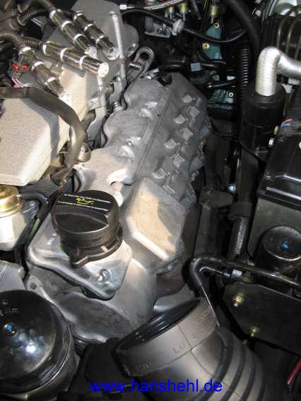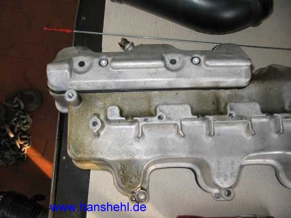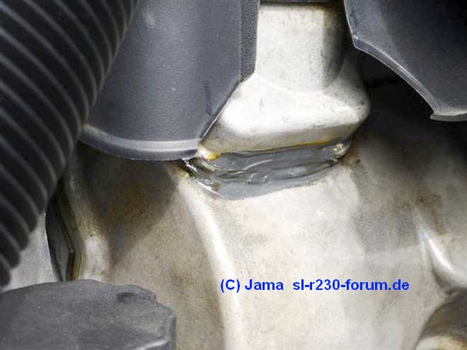 Bei meinem G55AMG von 2/2006 war an der linken Zylinderkopfhaube der zusätzliche Entlüftungsdeckel mit dem Öleinfullstutzen geringfügig undicht. Der kleine Deckel war mit Dichtmasse (vermutlich Loctite 5970 - A003989982010) abgedichtet. Stand Februar 2015: Wie sich in den nachfolgenden Jahren zeigte, war die MB-Dichtungsmasse nicht sehr haltbar, die Deckel waren seit längerer Zeit wieder etwas undicht. SL55AMG: Der SL55AMG hat den gleichen Motor, also gleiches Problem. Man kann sie selber abdichten, siehe Abschnitt 5 im Text. |