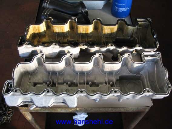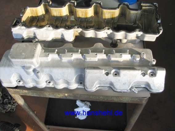 Mercedes durfte 2006 den alten Deckel (z.B. links: A1130104644) nicht abdichten (keine Arbeitsanweisung im WIS), auf Garantie gab es eine neue Zylinderkopfhaube (links: A1130100730, rechts A1130100430, 18 AW). Solche Abdichtarbeiten (außer Zylinderkopf) fallen nicht unter die ServiceVertrag Garantie. Die Undichtigkeiten treten auch bei den V6-Motoren auf, die den gleichen Deckel besitzen. |