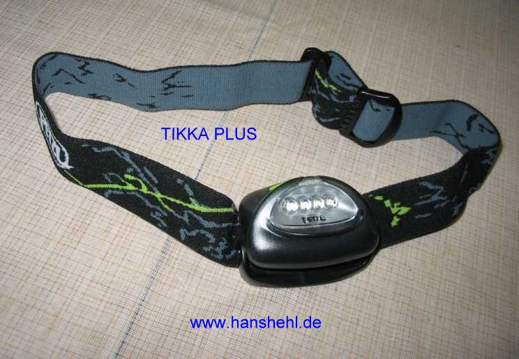 | Sehr praktisch ist bei nächtlichen Pannen eine LED-Kopflampe mit Stirnband, z.B. die TIKKA PLUS von Petzl mit dreijähriger Garantie. Die Leuchtstärke der 4 Leuchtdioden mit 35 Lumen ist in drei Stufen regelbar und als Blinklicht schaltbar. Drei kleine AAA-Batterien reichen 100 Stunden bei voller Helligkeit. | ![]() |