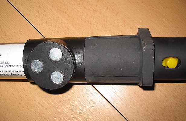 | Praktisch ist auch der verschiebbare Magnethalter. Eine rote LED zeigt die Ladezeit bei der Aufladung mit 12V an, danach sollte der Ladestecker abgezogen werden. | ![]() |