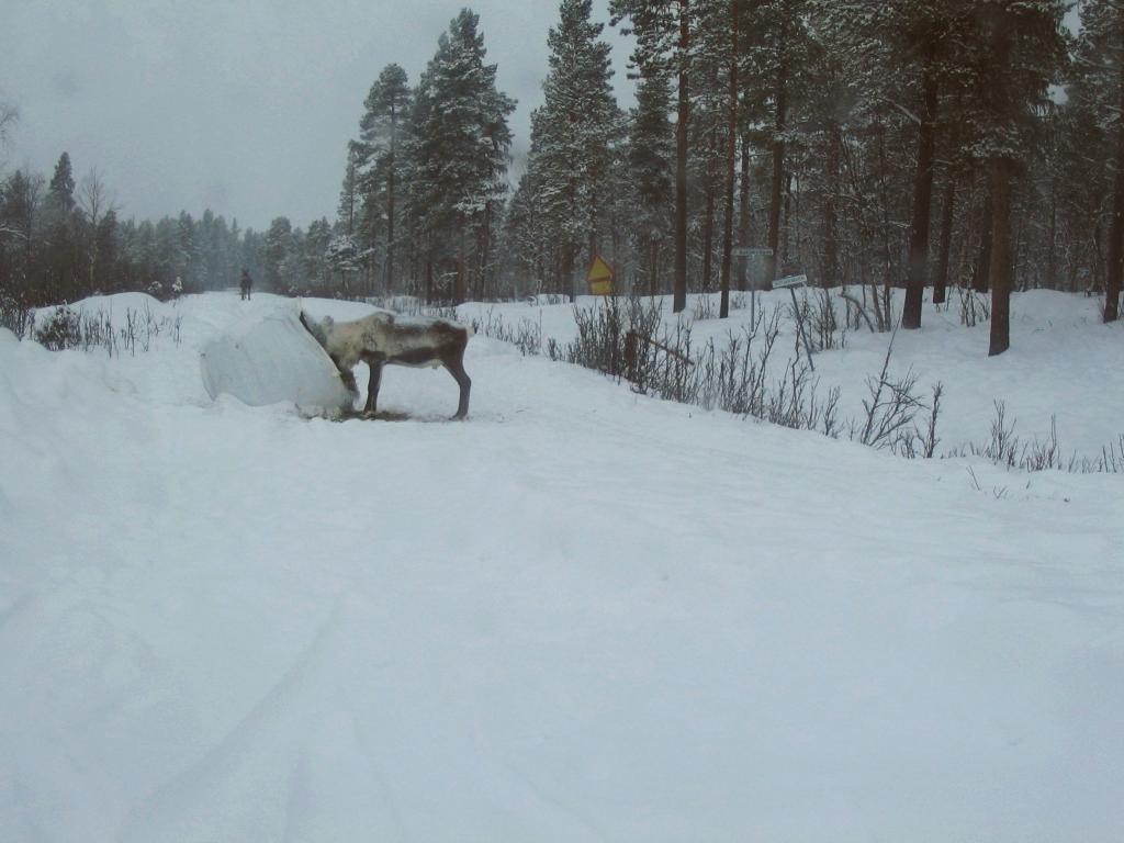 Auf der Fahrt am 02.03.2008 vom Hotel Lasisdalen kurz vor der Unterkuft in Laisvik sah ich eine Elchkuh mit 2 Kälbern, die zu einer Fütterung wollten, die von den Betreibern der Unterkunft und auch von Folker versorgt wurde. siehe Arjeplog Times Nr.6, Seite 6, 2009: We feed the moose the whole winter, so that they will stay”, says Micke.. | ![]() |