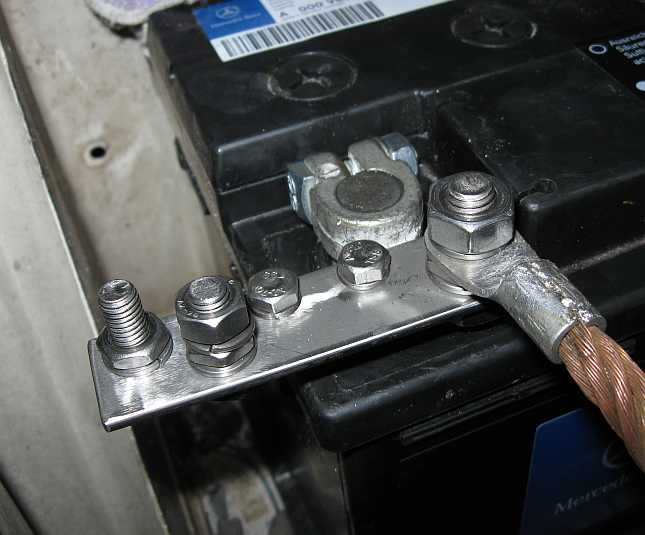 Leitfähigkeit: , siehe Wikipedia Für hohe Ströme ist also V2A als Leiter nicht so gut geeignet. Die Leitfähigkeit (in Siemens pro Meter) bei 27 Grad C. von Kupfer beträgt etwa 58,0 x 10|6 S/m, von Eisen (unlegiert) 10,02 x 10|6 S/m, von Edelstahl (1.4301) aber nur 1,4 x 10|6 S/m. Kupfer leitet über 40 mal besser als V2A. spez. Widerstandswerte: siehe Wikipedia Kupfer: 0,0169 - 0,0172 Ohm x mm2/m , V2A: 0,72 Ohm x mm2/m, Eisen 0,1 bis 0,15 Ohm x mm2/m ) Da nach 2010 der 280GE ab und zu und nur Kurzstrecke bewegt wurde, waren die Batterien nur mit dem Ladegerät im vollen Ladezustand zu halten. |