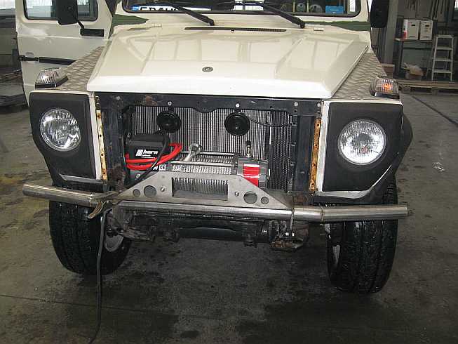 2009 wurde eine von der Firma Därr gesponserte Seilwinde HSW9500 an einen 280GE Bj. 1984 angebaut und getestet. Die Montageform sollte ähnlich wie auf den Bildern eines Wettbewerbs-300GE (Felix) für die Transilvania-Trophy (TAT) sein. |