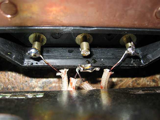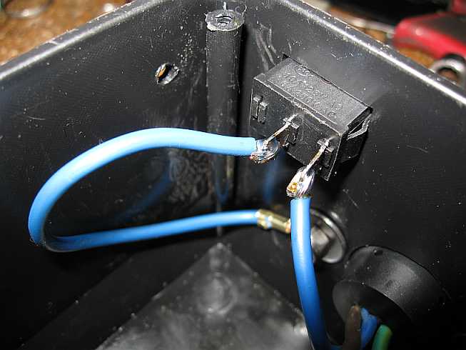 | Die Kabel sollten durch die Löcher (mit 2mm Bohrer aufbohren) an den Schalterfahnen geführt und dann erst verlötet werden. | ![]() |