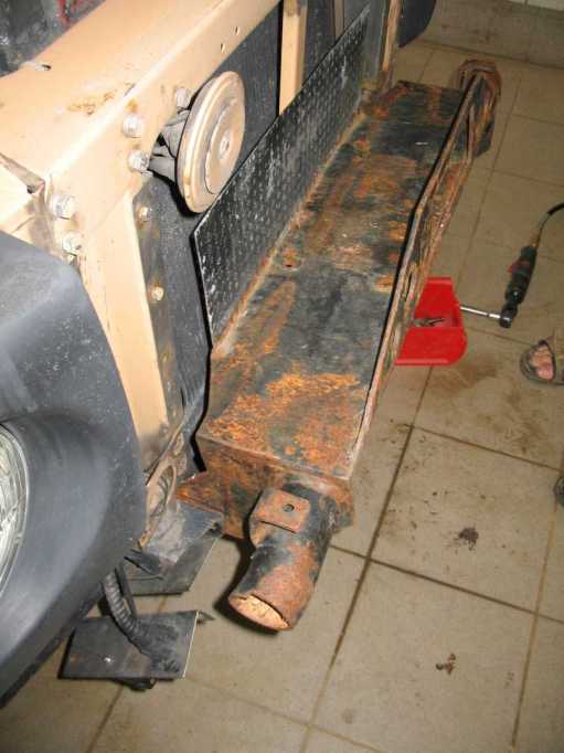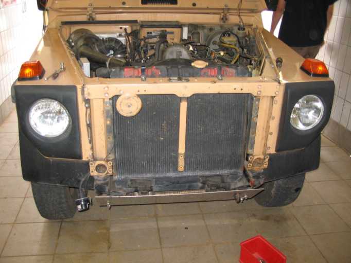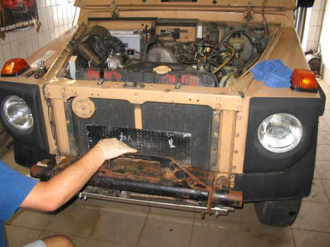 Beim 240GD machten wir einen Probeanbau mit einer alten Windenhalterung. Zunächst mussten der Frontbügel und die Stoßstange abmontiert werden. |