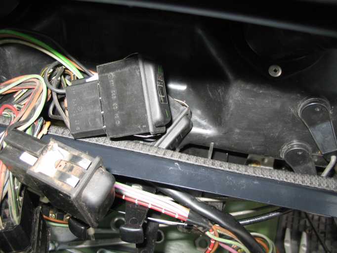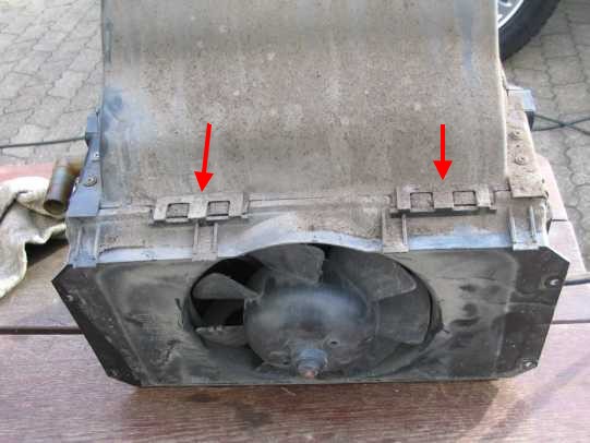 | Ist das obere Armaturenbrett ausgebaut, geht es am einfachsten. Der gesamte Gebläsekasten mit Wärmetauscher und Lüftermotor ist auf beiden Seiten mit je zwei Kreuzschlitzschrauben befestigt. | ![]() |