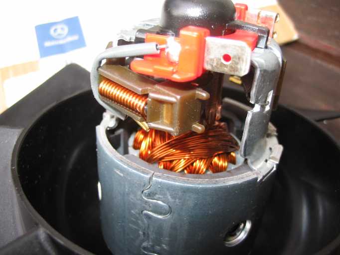 Der defekte Gebläsemotor hatte verschmorte Kohlenhalter. Einen neuen Bosch-Lüftermotor Nr. (alt: A0028204442