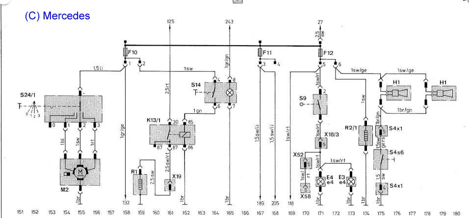 Lüftung geschlossen: 8,0 A - Lüftung offen: 6,7 A Leistung: etwa 100 Watt bis 85 Watt je nach Luftwiderstand. Anschluss: Lila +12 V: von Sicherung F10 (8 Amp.), Braun - Masse blau - Schaltstufe 1, schwarz - Schaltstufe 2, Rot - Schaltstufe 3 Legende Schaltplan: Heizungsdrehschalter: S24/1, Lüftermotor M2: |