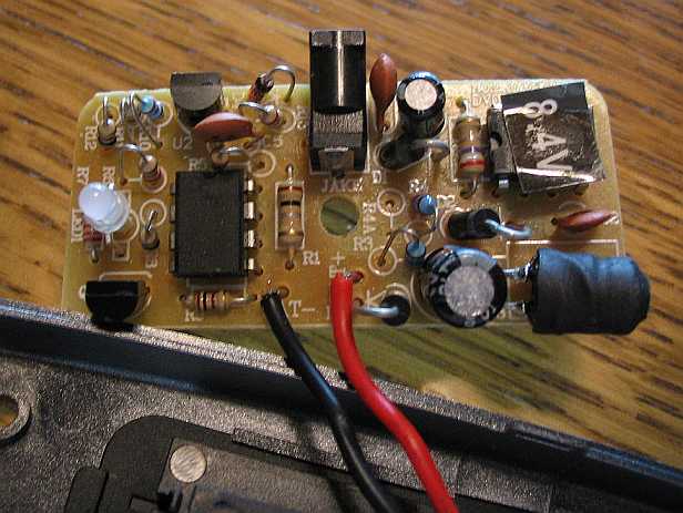 | Eine interne Ladeschaltung liefert 8,4 V für den Lithiumakku. Die Leuchtdiode wechselt von rot nach grün, wenn der Akku geladen ist. An den Kontakten des Adapters für den Akku sind 8,48 V messbar. | ![]() |