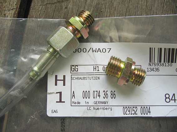 ![]() Teile / Anschlussstücke KA-Jetronic sind hier im Tipp 98-24-2, Abschnitt 11. Der Schlauch A4604700275 - 32,24 Euro ohne MwSt. ist am Dämpfer angeschlossen und führt zum Motor (Vorlauf). Das gebogene Anschlussstück hat die Überwurfmutter M14x1,5 und den Außenkegel 60 Grad. Auf der anderen Seite ist am Schlauch (COHLINE-3024, 0800-8x14, Aufdruck: Schlauch nicht knicken!) die Verschraubung M14x1,5 - Innengewinde) fest aufgepresst. |