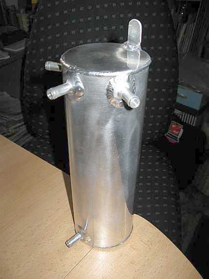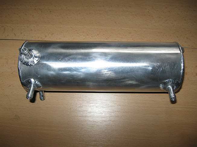 | Bei Schräglage und bei zu wenig Benzin im Tank wird ja Luft angesaugt. Das verhindert ein Catchtank Nr. 5657-0 mit vier Rohranschlüssen. Es ist ein kleiner Aluminium-Zusatztank (etwa 1 Liter Inhalt), der unabhängig von der Schräglage verhindert, dass von der Benzinpumpe Luft angesaugt wird. Es gibt ihn für 69 Euro bei der Fa. Isa-racing.de. Diese Firma zeichnet sich durch schnelle Lieferung und kompetente Hotline (Technik) aus, absolut empfehlenswert! | ![]() |