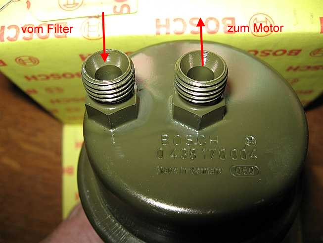 | Der Zulauf im Benzinfilter (Knecht KL19) erfolgt über eine spiralförmige Nut, damit das Benzin radial über die ganze Filterfläche strömen kann. | ![]() |