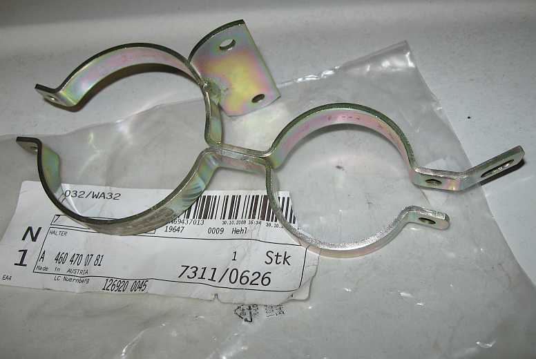 | Der Halter ist ab Werk mittels Gummipuffer (A1179880111 - 2,87 Euro ohne MwSt.) unten am linken Rahmenlängsholm befestigt. Dieser Montageort ist rostgefährdet, vor allem im Gelände. | ![]() |
