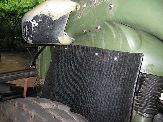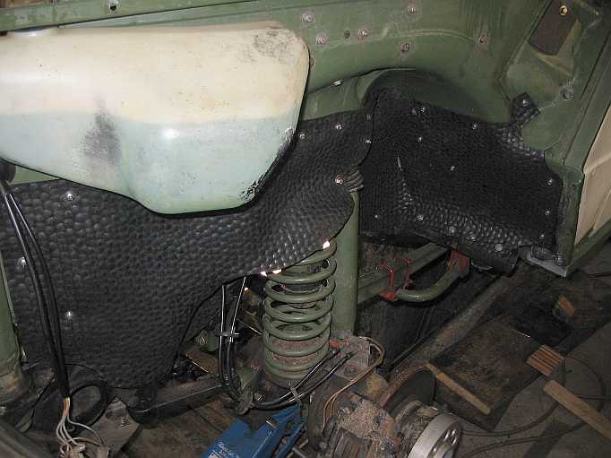 Aus einer 5 mm dicken Gummimatte (9,5 Kg - 54,26 inkl. MwSt.) habe ich im Juni 2010 einen Schmutz/Spritzschutz in den vorderen Kotflügeln gebaut. Einzelne Abschnitte sind mit dicken V2A-Blechschrauben befestigt. So ist auf der linken Motorseite der Warmlaufregler zugänglich, ohne dass man alles abschrauben muss. |
