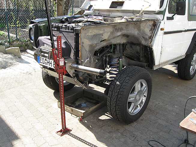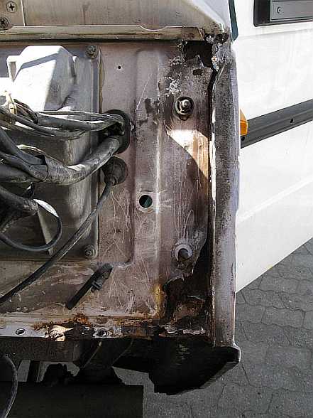 | Vor dem Abbau des Radeinbaubleches muss die Aufbaulagerung abgebaut werden. Der untere Pufferteller ist wie auf der rechten Seite auch abgerostet. Mit der Flex werden Abstandsrohr und Schraube durchtrennt, da sie im Alu festgefressen ist (siehe auch "Aufbaulagerung". | ![]() |
