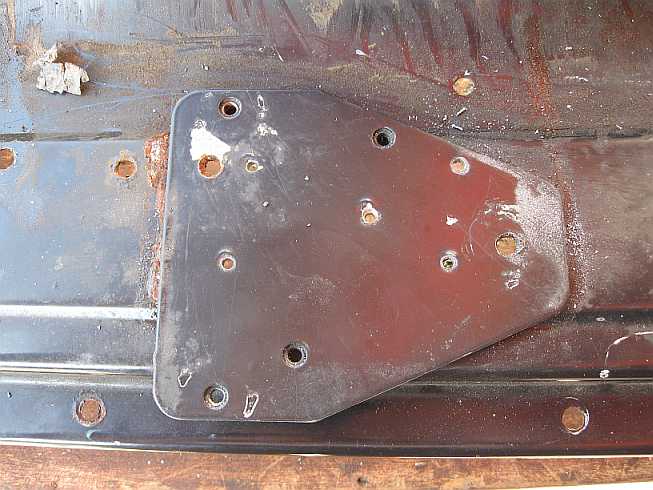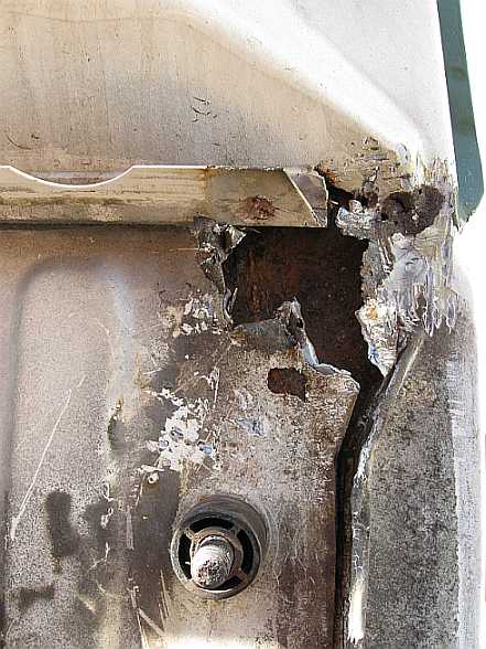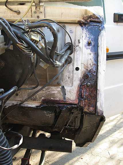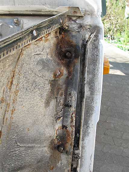 Unten an der Säule (auf der Innenseite) ist das Radeinbaublech fast durchgerostet. Die Säule wird abgetrennt (Punktschweißstellen ausfräsen). Die verrostete untere Ecke des Radeinbaublechs habe ich einfach abgeschrägt. Da das Radeinbaublech an die Säule angeschraubt wird, kann jedes zweite Loch zugeschweißt (Kupferblech unterlegen) werden. Oben wird ein Blechstück eingesetzt.