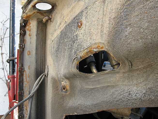 Die obere Kotflügelmutter an der Spritzwand widersetzte sich allen Lösebemühungen. Vom Rost war die Mutter gerundet. Erst nachdem ich die Mutter mit kleiner Schweißbrennerflamme an einer Seite bis zur Rotglut erwärmte, konnte sie mit einem scharfen Meissel und Hammer abgeschraubt werden. Eine Serviceöffnung oben am Kotflügel erleichtert in Zukunft den Abbau des Kotflügels. |